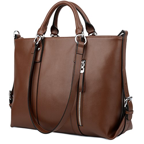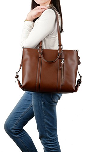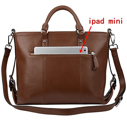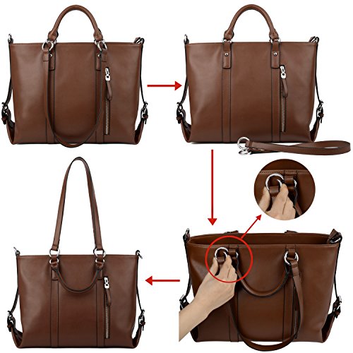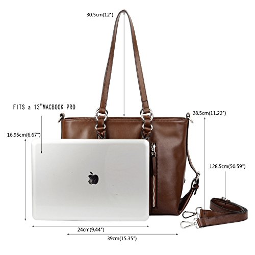 -. Feature : Cowskin Split Leather with Coating Finish. Special 3-Way Carrying Options: Handheld/Single Shoulder/Crossbody. / Sturdily constructed with Silver-tone hardware and fully lined with dark brown fabric. / Apart from the shortest handle and the longest crossbody strap(50.59"),there is a unique DETACHABLE HANDLE STRAP allowing you to convert the bag into a comfortable shoulder bag from a top-handle bag. / A front pocket for smartphone/keys,a back pocket for IPAD MINI/KINDLE.The main compartment has 2 zipped pieces and 2 open pockets for makeups.May hold A4 magazine, portable textbooks, wallet,umbrella and 13" Laptop. / Dimensions: 15"L x 12"H x 6"W(fit 13" laptop). The weight is 2.95 pounds.