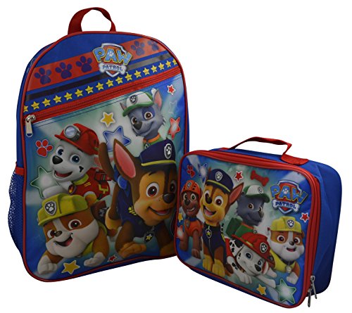 -. Brand : Paw Patrol -. Color : Blue/Red -. Department : boys -. EAN : 0708325411579 -. Feature : Brilliant colors for dazzling lunch time fun. / Sparkly design! perfect for school and vacations! Well known characters that your child will love having with them. The perfect set all year round! / Features one Main Compartment, one Front Compartment and Two side mesh Pockets. Backpack Dimensions (in inches): 15 x 11.5 x 5 / Insulated Rectangular Lunch Kit Product Dimensions (in inches):9.5 x 7.5 x 3.5 / Made of an easy to clean and very durable polyester -. PackageQuantity : 2 -. ProductGroup : Apparel -. ProductTypeName : LAGE -. Size : Large -. Title : Nickelodeon Paw Patrol Kid's Large Backpack & Matching Lunchbox Set -. UPC : 708325411579