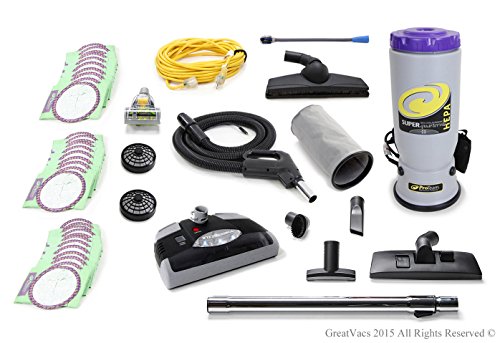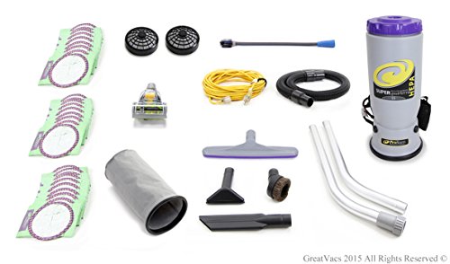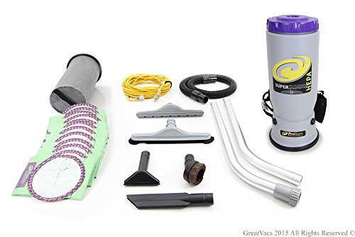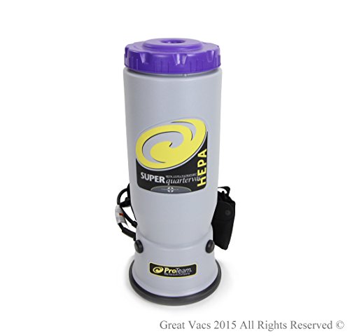 This is the Brand new ProTeam Super Quarter Vac. Newest model, with redesigned canister for a more comfortable fit on your back. The Super Quarter Vac vacuum is Pro-Team's commercial/industrial backpack vacuum. This powerful back pack vacuum's rugged design, without beater bars, drive belts or roller brushes makes it a perfect match for the tough demands of food services, office buildings, schools, hospitals, churches, movie theaters and hospitality. The Super Quarter Vac is the only back pack vacuum tough enough to last in the restaurant industry with a five-year motor warranty. The nine pound Super Quarter Vac is also ergonomically designed and easy to maintain and use. Studies from an independent laboratory comparing upright and backpack vacuum use have proven that operators using back packs vacuums: expend HALF the physical energy and perceived effort. Vacuum in HALF the time. These vacuums are ideal for cleaning commercial-grade carpeting, hard floors, chairs, sofas, blinds, stairs, and reaching up to clean heat and air conditioning vents as well as over door and window trim. There are no belts, brushes, or beater bars. There are 3 filters to protect the motor from grease and dirt. Sound mufflers aid in quiet operation. The Super Quarter Vac with restaurant kit has a 50' cord, 12 paper filter bags, 2 cloth filter bags, 56" 2 piece wand, 14" carpet tool, 3" dust brush, 5" upholstery tool, 11" crevice tool and 14" hard floor tool with nylon brush. The Quarter Vac comes with a 5 year motor warranty.Feature