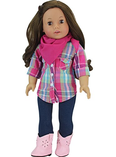 Western 4 Piece Set for 18 Inch Dolls. Set includes hot pink and teal plaid blouse, denim leggings, pink bandana and pink cutout cowgirl boots. Doll Not Included. © 2016 Sophia's- All Rights Reserved. Not affiliated with American Girl®, Reg. Trademark of American Girl, LLC.Feature