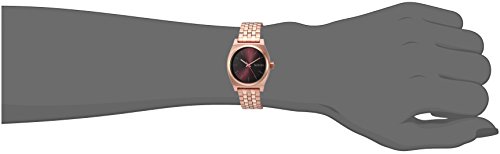 Nixon® keeps it classy with The Medium Time Teller X The Mahogany Rose. Custom solid stainless steel case and solid stainless steel fixed bezel. Hardened mineral crystal. Triple gasket stainless steel crown, stainless steel screw down caseback and spring pin lugs. 19.5 - 18 mm tapered custom five-link stainless steel jewelry style bracelet and stainless steel locking clasp. Miyota Japanese quartz three-hand movement. Dial features:• Applied indices.• Custom molded hands. Water resistant up to 100 meters. Imported. Measurements: Case Height: 31 mm Case Width: 31 mm Case Depth: 9 mm Band Width: 5⁄8 in Band Circumference/Length: 8 1⁄4 in Weight: 2.4 oz This product may have a manufacturer's warranty. Please visit the manufacturer's website or contact us at warranty@support.zappos.com for full manufacturer warranty details.Feature