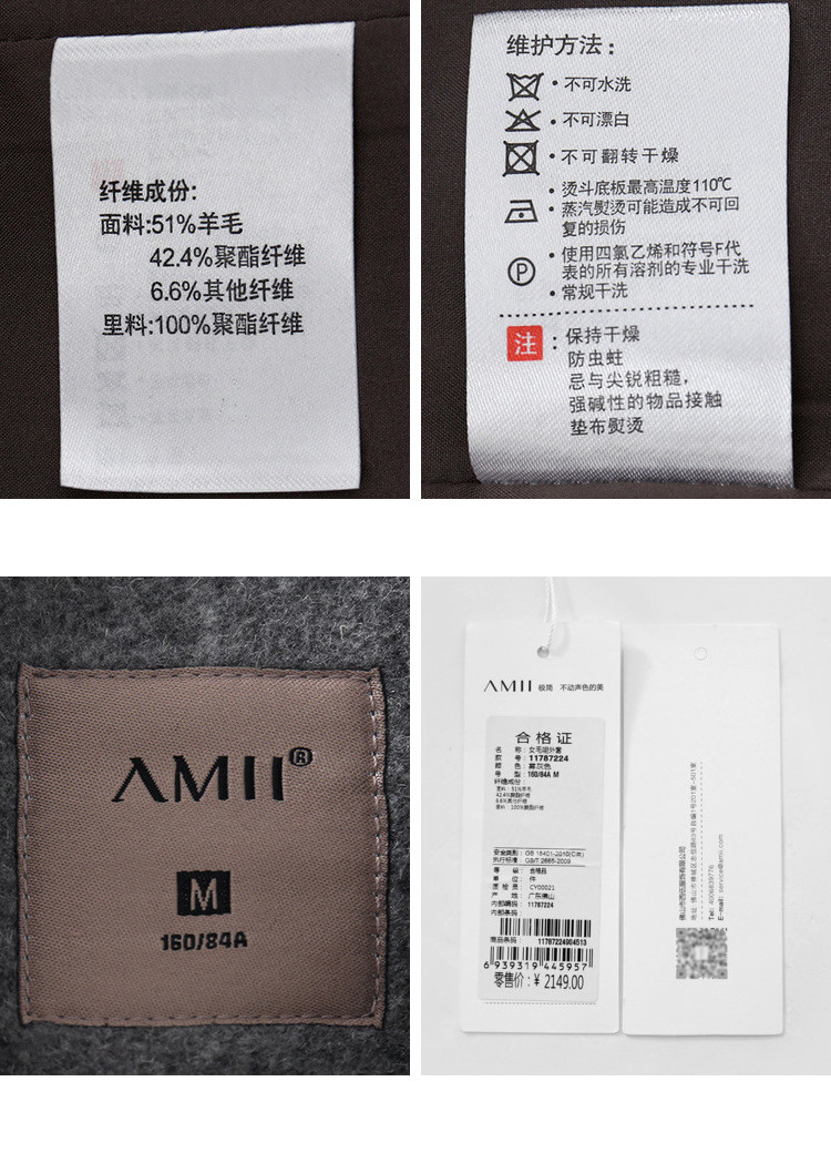 | 面料成分: | 面料:51%羊毛,42.4%聚酯纤维,6.6%其他纤维 里料:100%聚酯纤维 |