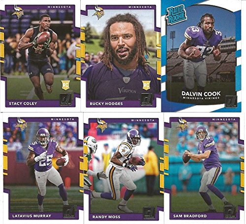 Minnesota Vikings 2017 Donruss NFL Football factory sealed 12 card team set including Randy Moss, Sam Bradford, Adam Thielen, Xavier Rhodes, Latavius Murray, Jerick McKinnon, Anthony Barr, Harrison Smith, Stefon Diggs plus Rookie cards of Dalvin Cook, Bucky Hodges and Stacy Coley.
