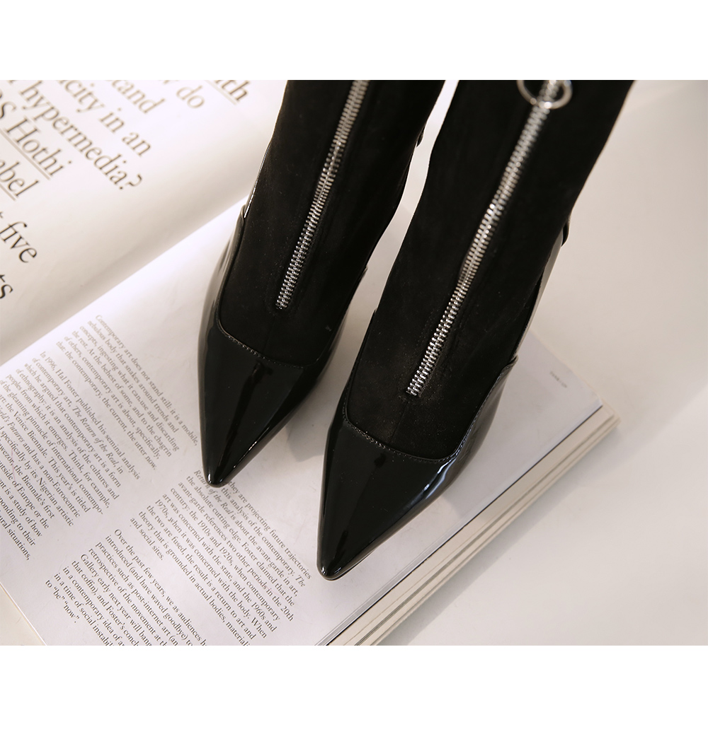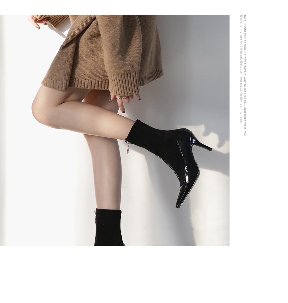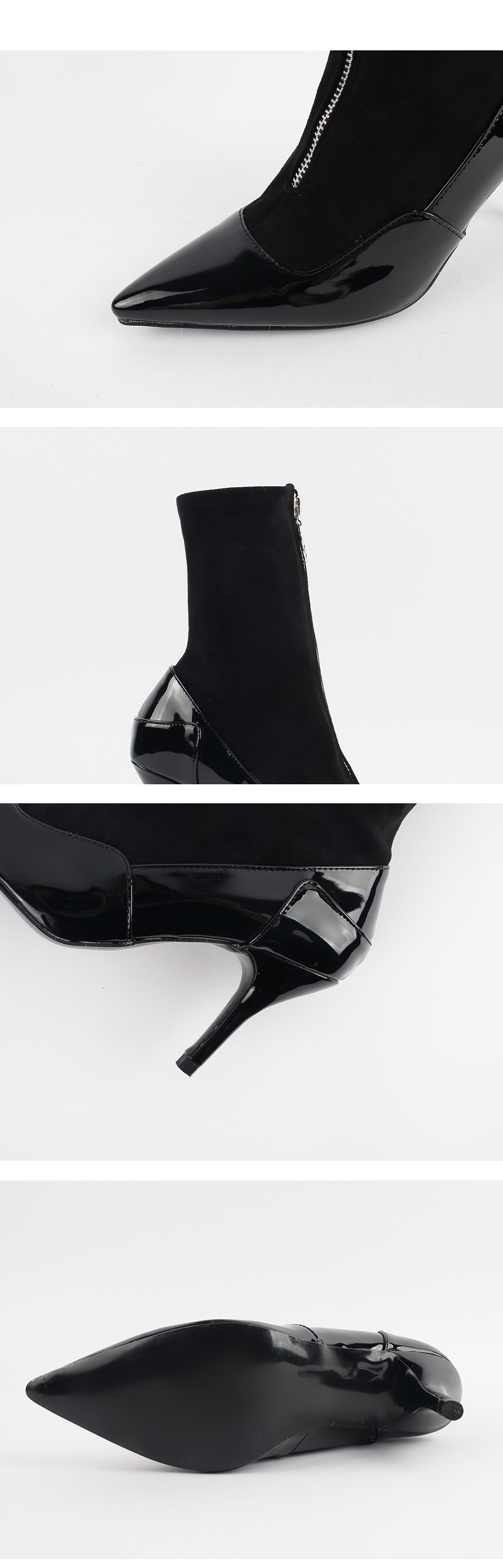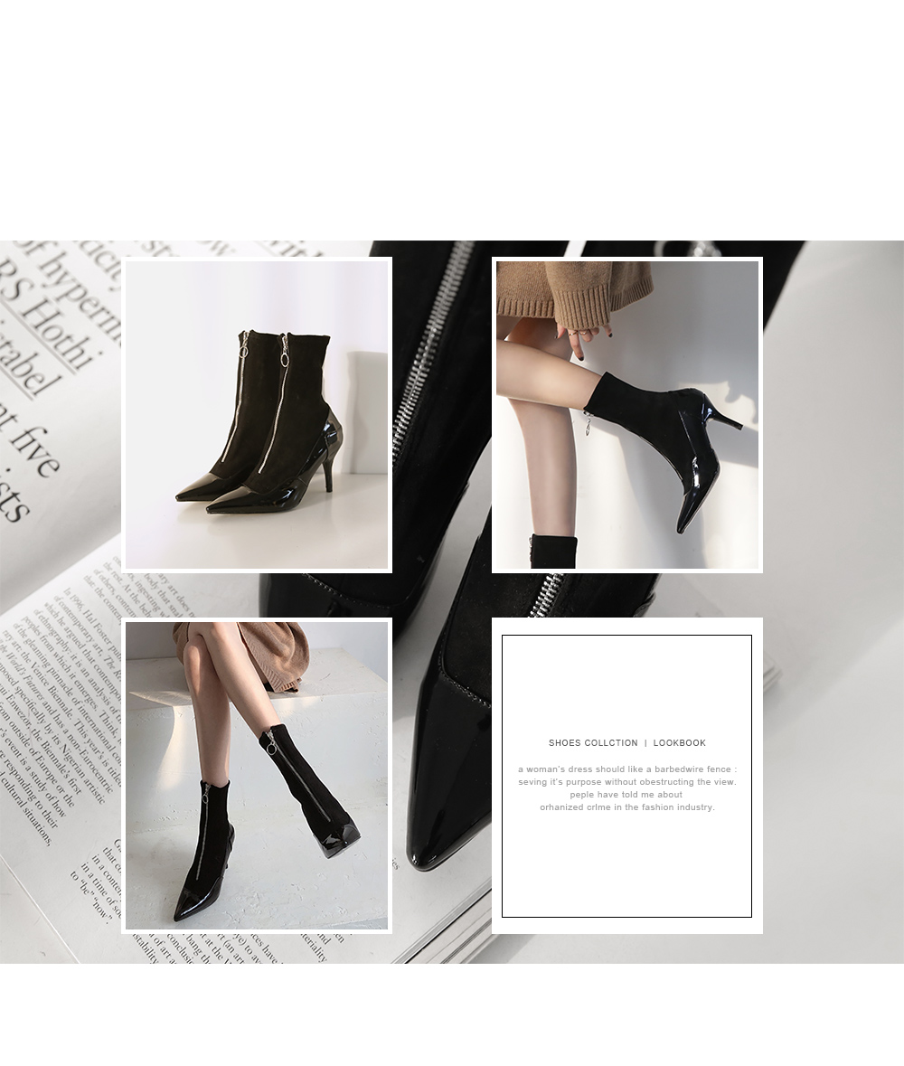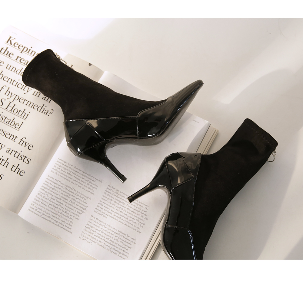 DETAILS - 소재 : 에나멜 인조스웨이드 - 컬러 : black - 안감 : 없음 - 피팅감 : 정사이즈 / 무게 : 보통인편 - 착화감 : 발목 부분이 스판 소재로 편안해요 - 모델피팅 : 235