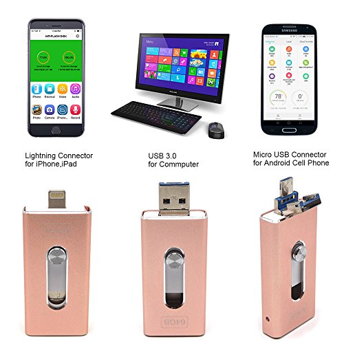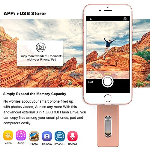 -. Feature : Fully Compatible: 3 in 1, It Can Be Used for iPhone & iPad, Android Smart Phone and Mac/PCs / Super Speed: USB 3.0 Adaptor, Reading Speed: 30 M/S; Writing Speed: 17 M/S; High Capacity: 128GB / User Friendly App: Install Free App "i-USB Storer" for i-Devices. It Supports Shooting Picture, Video and Save Directly to Flash Drive. / Interface: Lightning (iPhone, iPad); Micro USB (Android Smart Phone); USB 3.0 (Computer) / External Storage: Transfer and View Photo, Video, Audio, and Document Between Smart Phones, Pad, PCs/Macs Smoothly and Fast.