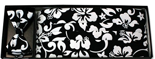 -. Title : Black and White Hawaiian Floral Bow Tie and Cummerbund Set