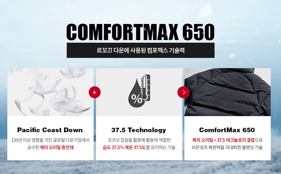 ▶ ComfortMax 650(블렌딩 다운) = Pacific Coast Down(북미 오리털) + 37.5 Technology(기능성 원사)