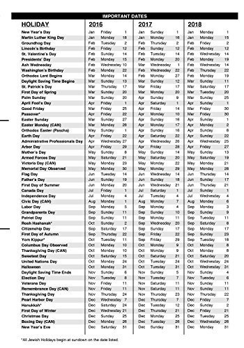 -. Feature : January 2017 - December 2017, featuring 12 months for easy planning / Daily pages: one page per day with monthly overview section, featuring hourly appointments. Monthly pages: one month per two-page spread with a tab for each month / Week begins on Monday, P.R.Inted monthly indicators / Black, suede-like cover creates a professional look and appeal / P.R.Inted with high quality soy-based inks on 100% recycled paper, which is FSC certified. Made in the USA