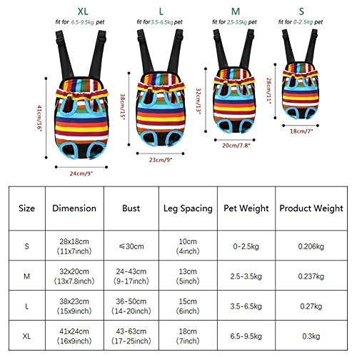 Size Table:? S : Dog Chest--18.1" Dog Weight 0-5.5 lb Bag Length(without strap)-11.8"? M : Dog Chest--21.3" Dog Weight 5.5-8.8 lb Bag Length(without strap)-13.4"? L : Dog Chest--24.4" Dog Weight 8.8-15.4 lb Bag Length(without strap)-15.0"? XL : Dog Chest--27.6" Dog Weight 15.4-22.1 lb Bag Length(without strap)-16.5" To ensure the best fit, please be sure to take note of all the dimensions as well as weight recommendations.? Here at Kuoser, we stand by our products 100% with a 12-month warranty. A happy purchasing experience is our #1 priority and we will happily send a product replacement if any issues arise.