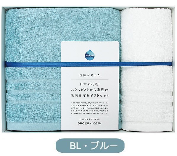 感染症やアレルギー疾患を研究する専門医療機関と、老舗タオル会社の「JOGAN」がタッグを組み、高機能ながら、軽やかで吸水性に優れた使いやすさを実現しました。ホワイトのウォッシュタオル1枚、ピンクもしくはブルーのフェイスタオル1枚が入ったギフトセットです。 |