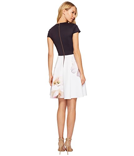 The party's is a skater dress style with cut out details and a floral design. It has capped sleeves and hits above the knee.