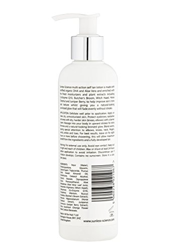 ORGANIC INGREDIENTS: Our multi-action sunless tanning lotion is made with the best natural organic ingredients. Certified Organic Aloe Vera to hydrate the skin, Certified Organic DHA for a gorgeous natural-looking tan, Co-Enzyme Q10 to help tighten and tone skin, Horse Chestnut to help boost sluggish circulation, Juniper Berry Extract, Witch Hazel, Sweet Almond Oil and Vitamin E to deliver intense hydration and help extend the life of each application by keeping skin smooth, soft and supple.