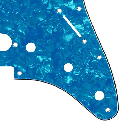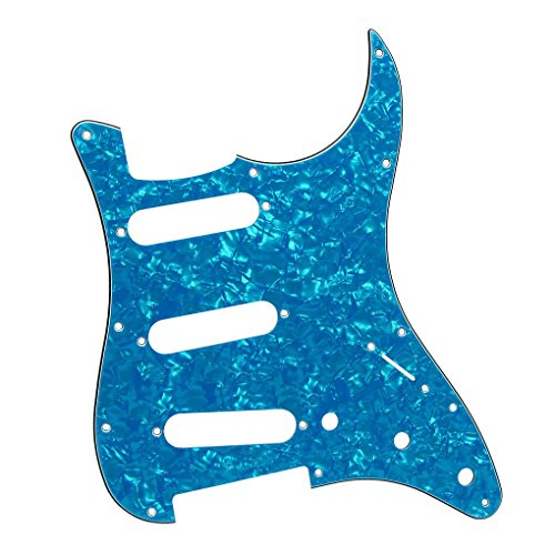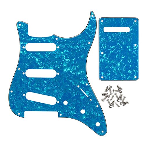 Product Description Feature: * For US Modern Fender Strat Stratocaster style guitar or similar.* With pure aluminum foil shield on the backside, not the common aluminum-foil paper on the market, better shielding property and anti-interference.* All materials are environmentally friendly, thermostability, no smell. Multi-layer plates are pressed under high temperature and pressures, to make them close integration between each layer, will not appear curly, deformation, or separation of different layers.* Excellent product process ensure the edge of the smooth and structured.Two layers of protective films on the front of pickguards, anti-scratch to protect the guitar.Specification:* Style: SSS(single/single/single coil) style pickguard; 11 screws holes in the side of pickguard. 6 holes in the side of backplate* Material: 4Ply Pearl Plate and PVC* Color: Light BLUE Pearl* With protective film on the surface, while using please split it off.* Note:Item's color might be different from the picture because of the aberration.Package Includes:1 x guitar pickguard1 x back plate25 x pickguard screws 0