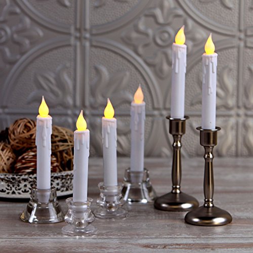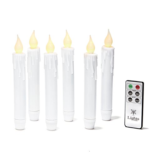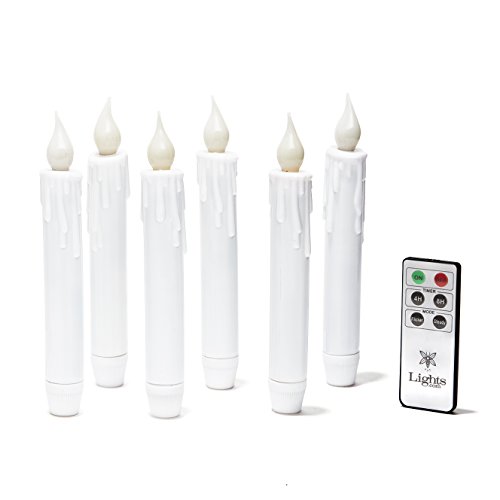 Description: Set of 6 white taper candles with 1 warm white LED in each. These tapers feature a faux drip detailing and a 6 function remote. A great addition to dinner parties and holiday decor, these flameless tapers will set the mood without the hassles associated with traditional candle flames.
