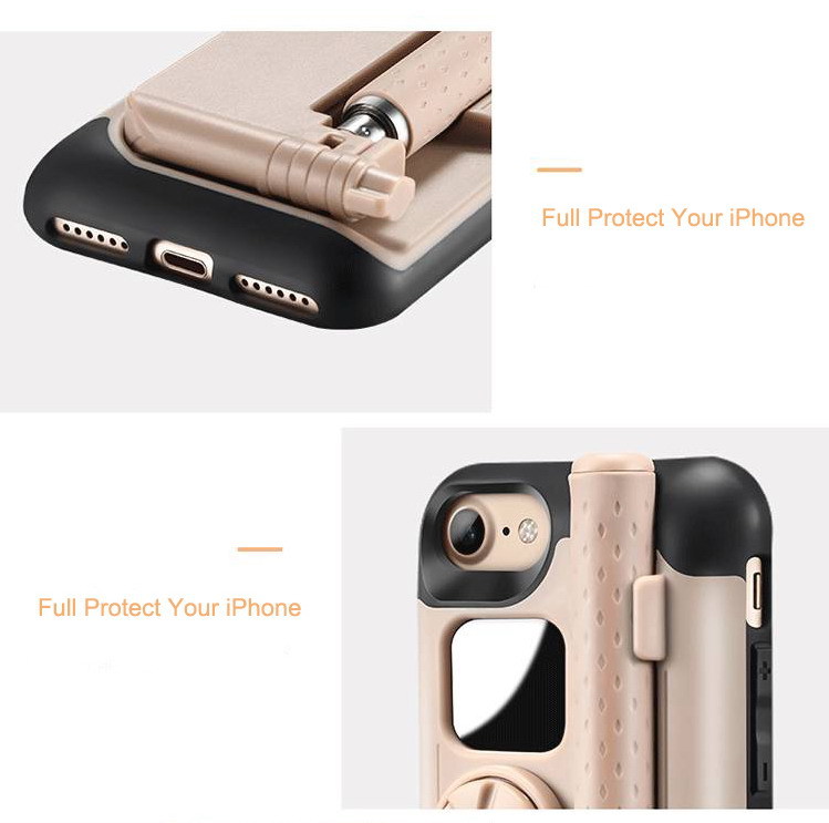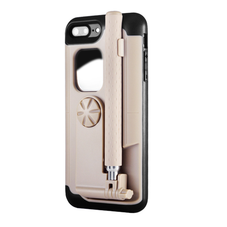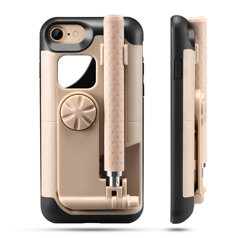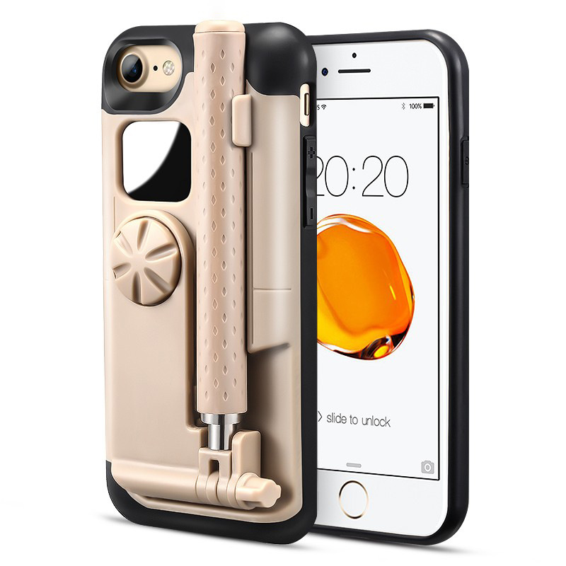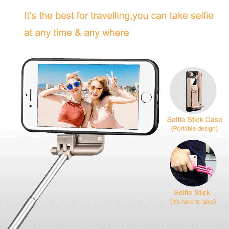 2 in 1 Multi-Function: Selfie stick plus for iPhone 7/8 Plusu0026nbsp;case together.Premium Design: Built into cell phone case with sturdy yet remarkably lightweight and retractable aluminum stick, very convenient and easy to carry.Rear Camera Positioning: Built with a clear mirror for rear camera, you can clearly watch your position on camera by this mirror, you can also make up yourself by the mirror before taking photo.Rechargeable Remote Control: Lasts an impressive 26 hours on a single charge, and uses 59400 times per charge.Pocket Size: Selfie stick iphone case can be put into your pocket, will give you a relaxing trip.