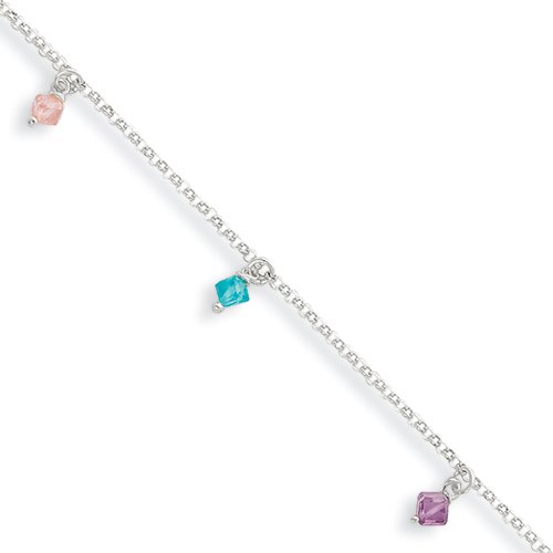 Accessorize your ankles with a feminine bracelet that combines color and movement with each step you take. Dangling from this 2mm, adjustable 9-10 inches, sterling silver cable chain is 4mm multicolored crystal beads. A fancy lobster clasp keeps this charming anklet securely fastened.Feature