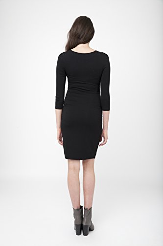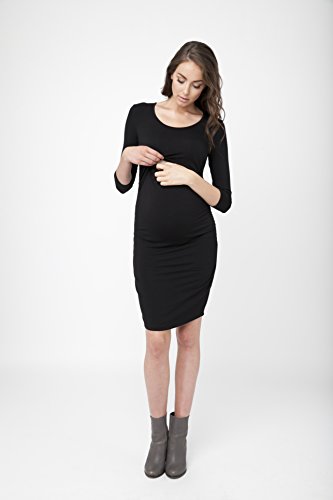 Viscose / elastane stripe long sleeve nursing dress. This dress features a bold stripe, a scooped neckline and side seam gathering. Discreet feeding access occurs by lifting the double layer at bust. A smart dress that can be worn during and after your pregnancyFeature