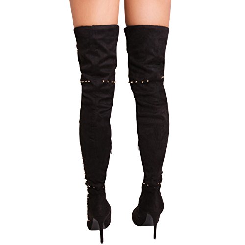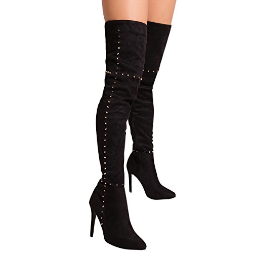 Binding : Apparel Product Description These over the knee boots feature a pointy toe silhouette, soft vegan suede with decorative stud accents, elastic gore insert at collar, and slim stiletto heel. Finished with a cushioned insole and partial side zipper closure. 0