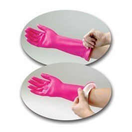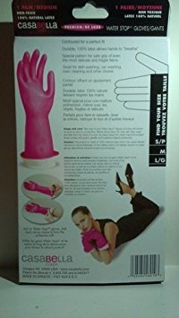 Studio : Casabella Publisher : Casabella Binding : Misc. Product Description Two pairs of size large Waterstop Rubber Gloves by Casabella. Latex with cotton flocked lining. Patented design with extra-long cuffs that turn up to catch drips and help keep inside of gloves dry. Non-slip textured surface provides a safe grip. Lipstick pink for cleaning in style. Casabella cleaning tools, kitchen and bath accessories and organizing products have received numerous design awards and industry recognition for beautiful design and high quality workmanship. 0