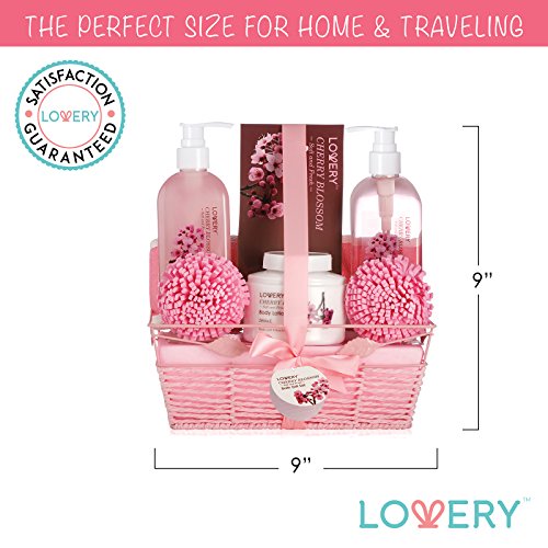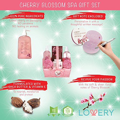Spa Gift Basket in Cherry Blossom Fragrance - 8 Piece Bath Set Includes Shower Gel, Bubble Bath, Bath Salt, Body Lotion & More! Great Mother's Day, Wedding, Anniversary or Graduation Gift for Women