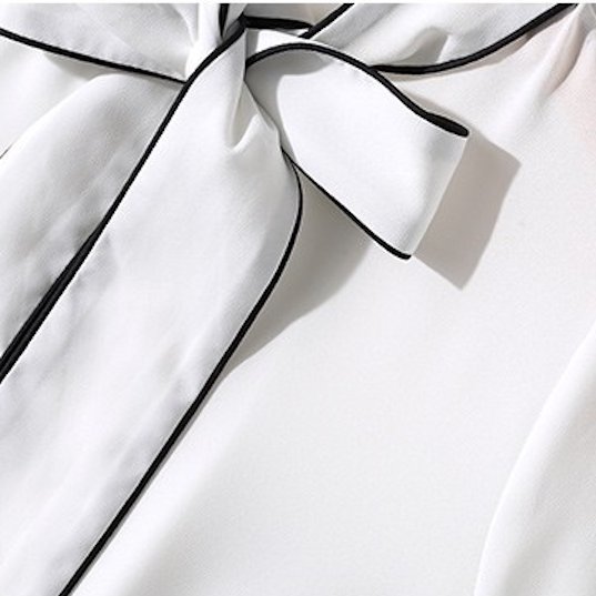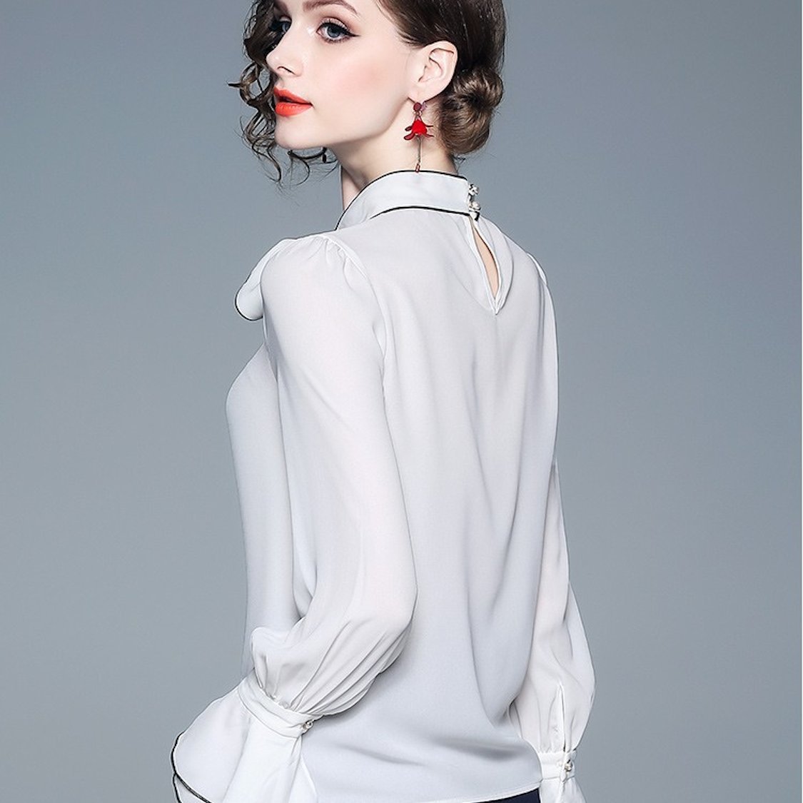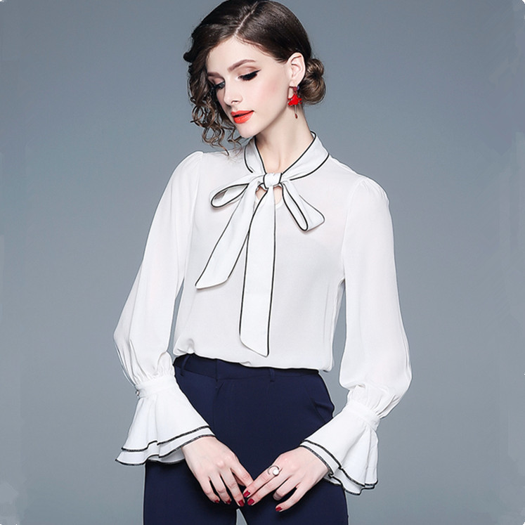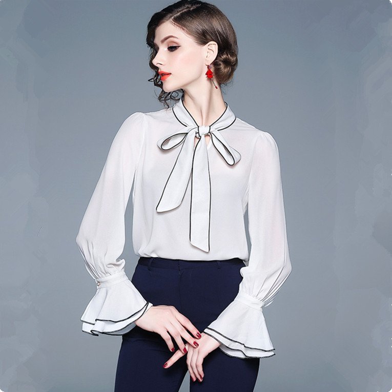 縁取りデザインにボリュームのあるフレア袖がお洒落なブラウス。
