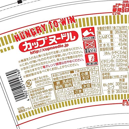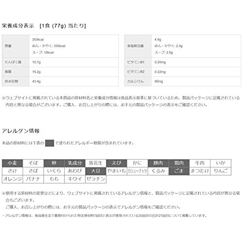 原材料:油揚げめん(小麦粉、植物油脂、食塩、チキンエキス、ポークエキス、しょうゆ、たん白加水分解物、香辛料)、かやく(味付卵、味付豚肉、味付えび、味付豚ミンチ、ねぎ)、スープ(糖類、粉末しょうゆ、食塩、香辛料、たん白加水分解物、香味調味料、ポークエキス、メンマパウダー)/加工でん粉、調味料(アミノ酸等)、炭酸Ca、かんすい、カラメル色素、増粘多糖類、カロチノイド色素、乳化剤、酸化防止剤(ビタミンE)、香辛料抽出物、くん液、ビタミンB2、ビタミンB1、香料、酸味料、(一部にえび・小麦・卵・乳成分・ごま・大豆・鶏肉・豚肉を含む)