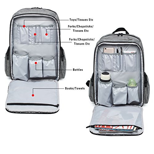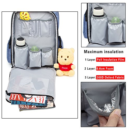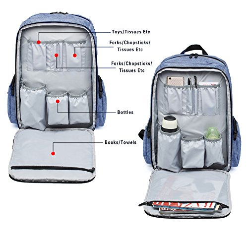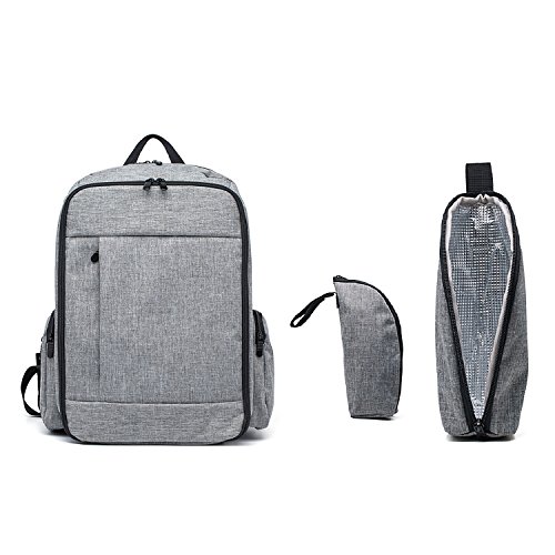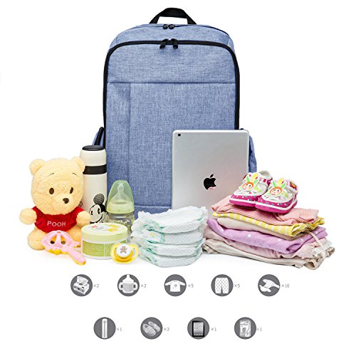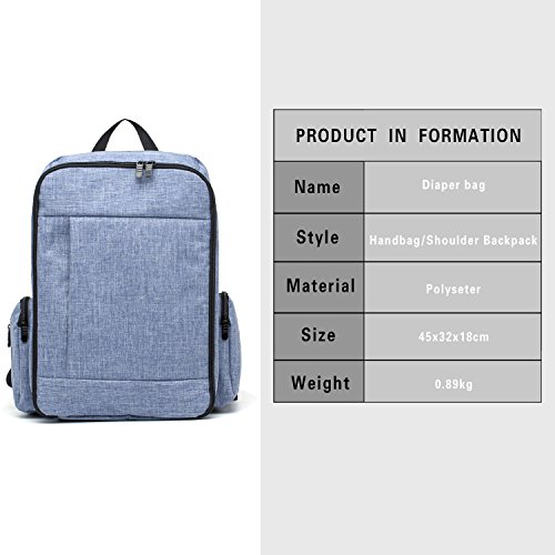 ProductDetails: Material: Backpack Baby Bag: Waterproof and Environmental Oxford Fabric. Dimensions: Backpack Diaper:(L x W x L)17.7' x 12.5" x 7'; Waterproof Thermal Insulation Bag:(L x W x L)9.8' x 2.1' x 2.7'; Weight:1.8 LB Support the maximum weight:45 LB Color: Blue, Grey Feature: 1,This diaper bag that would be easier to carry around than the traditional tote type; 2,Backpakc Straps with elastic band, can hang sunglasses and other things, easy to take; 3,There are so many pockets which can store my all little stuffs like small water bottle, wet tissue, mosquito repellent, etc.It also comes with 1 Waterproof Thermal Insulation Bag. This diaper bag provides large capacity. 4,You can carry it by 3 ways: Backpack Diaper Bag with the backpack Strap; Handle Diaper Bag with the Top Handle; It can be hung on the baby carriage through the hanging belt on the backpack strap, 5,2 color to choose since it is unisex and the baby's gender is a secret. it is??very durable and it will be able to handle and hold everything that the baby will need.Easy??to wipe down.Extremely useful, sturdy, and handles work so well. Package Including:
