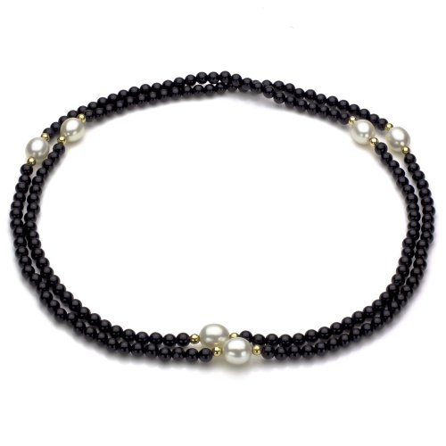 8-8.5mm White Freshwater Cultured Pearl, and 3-4mm Simulated Black Onyx with 12pcs 3mm Yellow Gold Beads Endless Necklace 30" Length. This Necklace is Unknotted, and Have a Matching Hoop Dangle Earrings Set.Feature