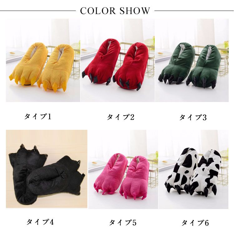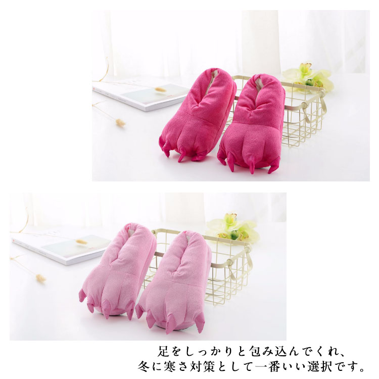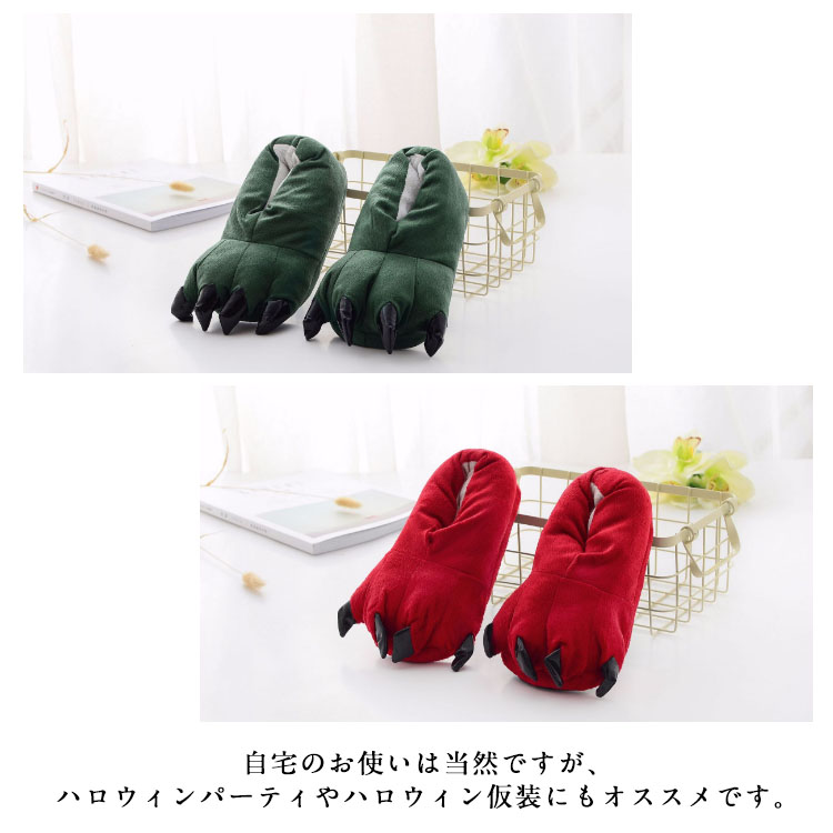 | 超柔らかくてふんわりとした感覚がる素材で作られた爪付きの恐竜スリッパが登場します。厚手ですが、軽くて歩きやすいアイテムです。足をしっかりと包み込んでくれ、冬に寒さ対策として一番いい選択です。自宅のお使いは当然ですが、ハロウィンパーティやハロウィン仮装にもオススメです。 | |