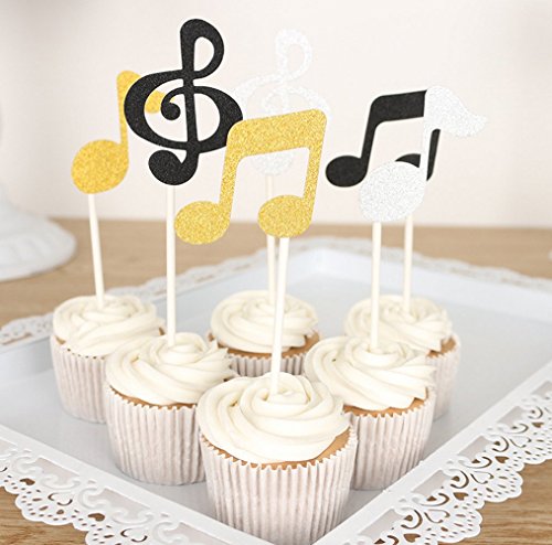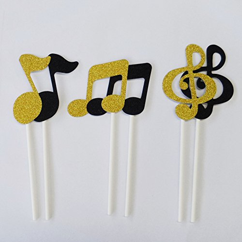 Yunko 12pcs Shiny Musical note Party Fun Cup Cake Decorative Toppers Cupcake Decorating Tools for Halloween Party (Gold and Black)