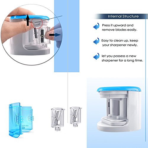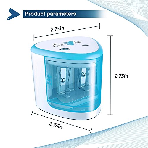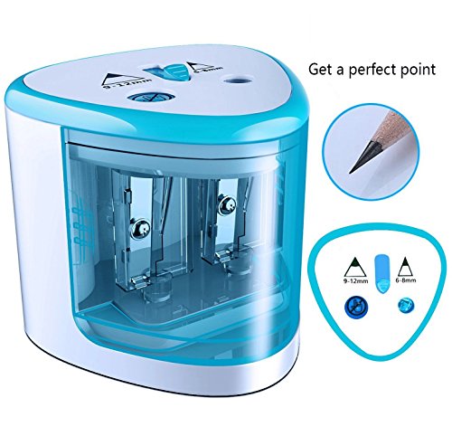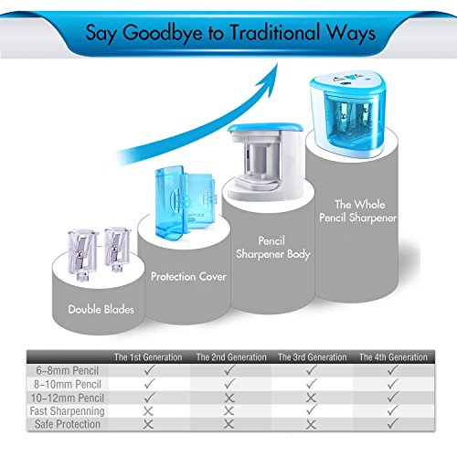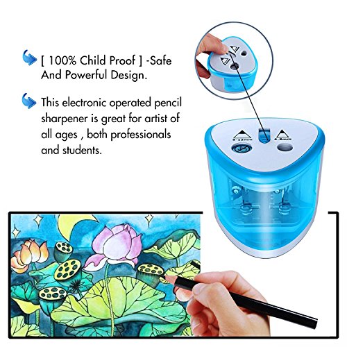Automatic Operation: Once put pencil into the hole, it will automatic sharpen and auto-stop until take out your pencil, it sharpens a new pencil in 10-15 seconds. Besides, it has a safety mechanism that keeps children from putting their little fingers into the holes.