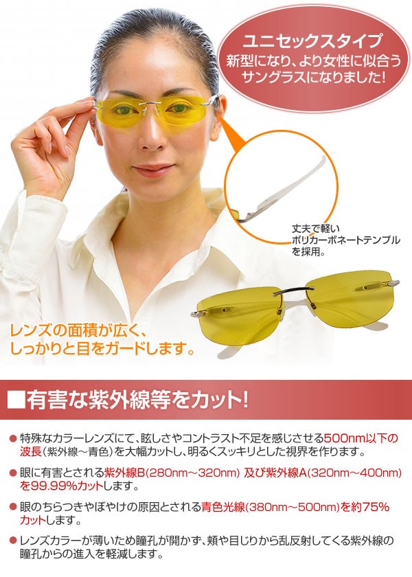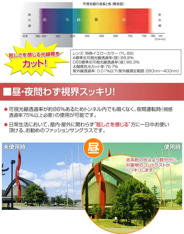 | 特殊なカラーレンズで有害な紫外線や青色光線をカット!明るくスッキリとしたコントラストの良い視界が広がります。眩しさが気になる方におすすめ。日常のあらゆる場面でお使いいただけます! |