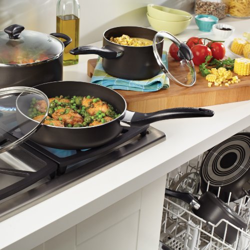 • Top-quality nonstick interiors release foods easily for fast cleanup; cookware is dishwasher safe for even more convenience