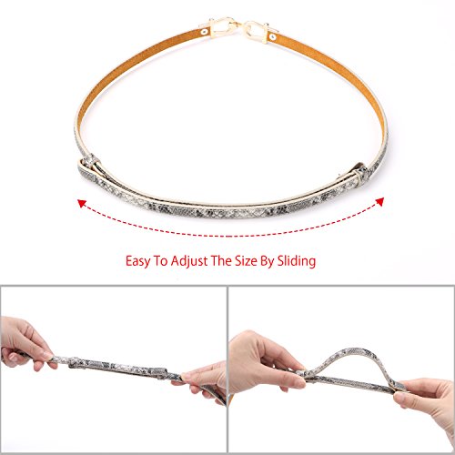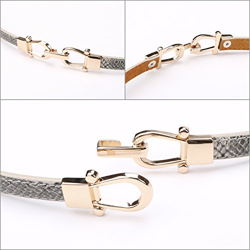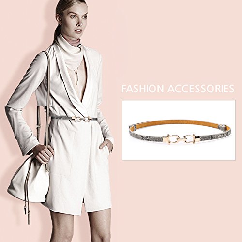 -. Feature : ▶MATERIAL & COMFORT--- This 2 pack women thin belt is made of high quality genuine cowhide leather and raw leather inside,extremely soft and comfortable to wear. / ▶SIZE INFO--- This leather skinny belt is fully adjustable.Belt total length:97cm/38.8",perfect for waist size below 33",belt width 0.48";Buckle length: 2.8",buckle width: 0.72".(Consider about 2cm error) / ▶BUCKLE & ADJUSTABILITY--- Interlocking metal buckle,easy to wear or take off. The belt back sliding feature make the distinctive adjustable design. / ▶STYLISH & SIMPLE--- Elegant texture surface and 4 classic colors for choice(Black,White,Red,Gray).Perfect belt accessory to shape your waist for blouse, dress, skirt, jeans or sweater to make you unique and classy. / ▶GIFT BOX PACKAGE & GUARANTEE--- The package includes 2 women thin belt + 1 gift box; 100% satisfaction guaranteed, 45 days free exchange and returns plus 180 days warranty.
