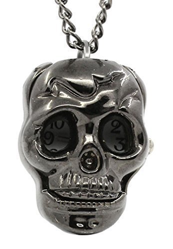 -. Title : Souarts Gunmetal Skull Shape Quartz Pocket Watch with Link Chain 84cm