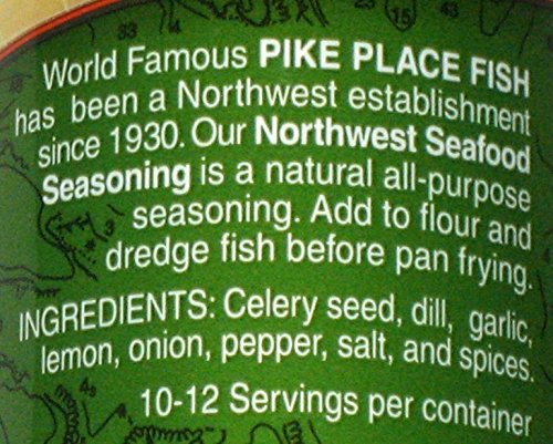 -. Feature : 4oz. / World Famous PIKE PLACE FISH has been a Northwest establishment since 1930. Our Northwest Seafood Seasoning is a natural all purpose seasoning. Add to flour and dredge fish before pan frying. / Ingredients: Celery seed, dill, garlic, lemon, onion, pepper, salt and spices. / 10-12 Servings per container.