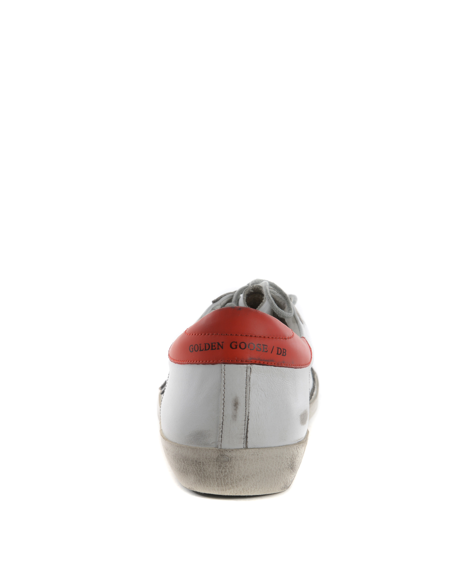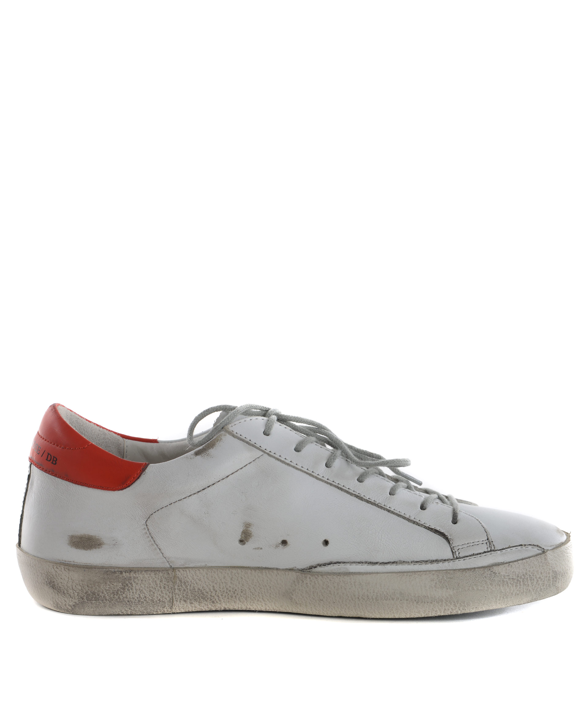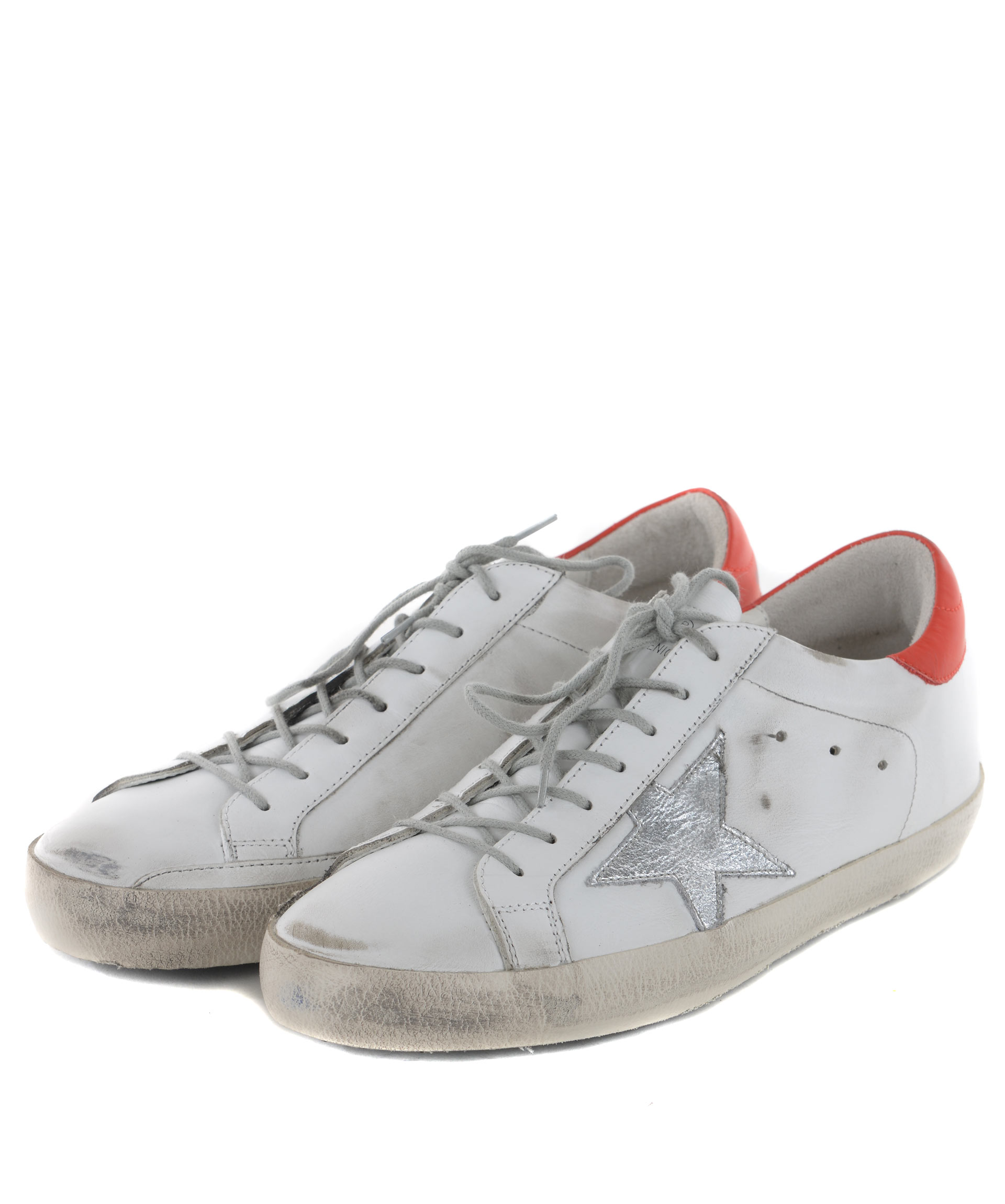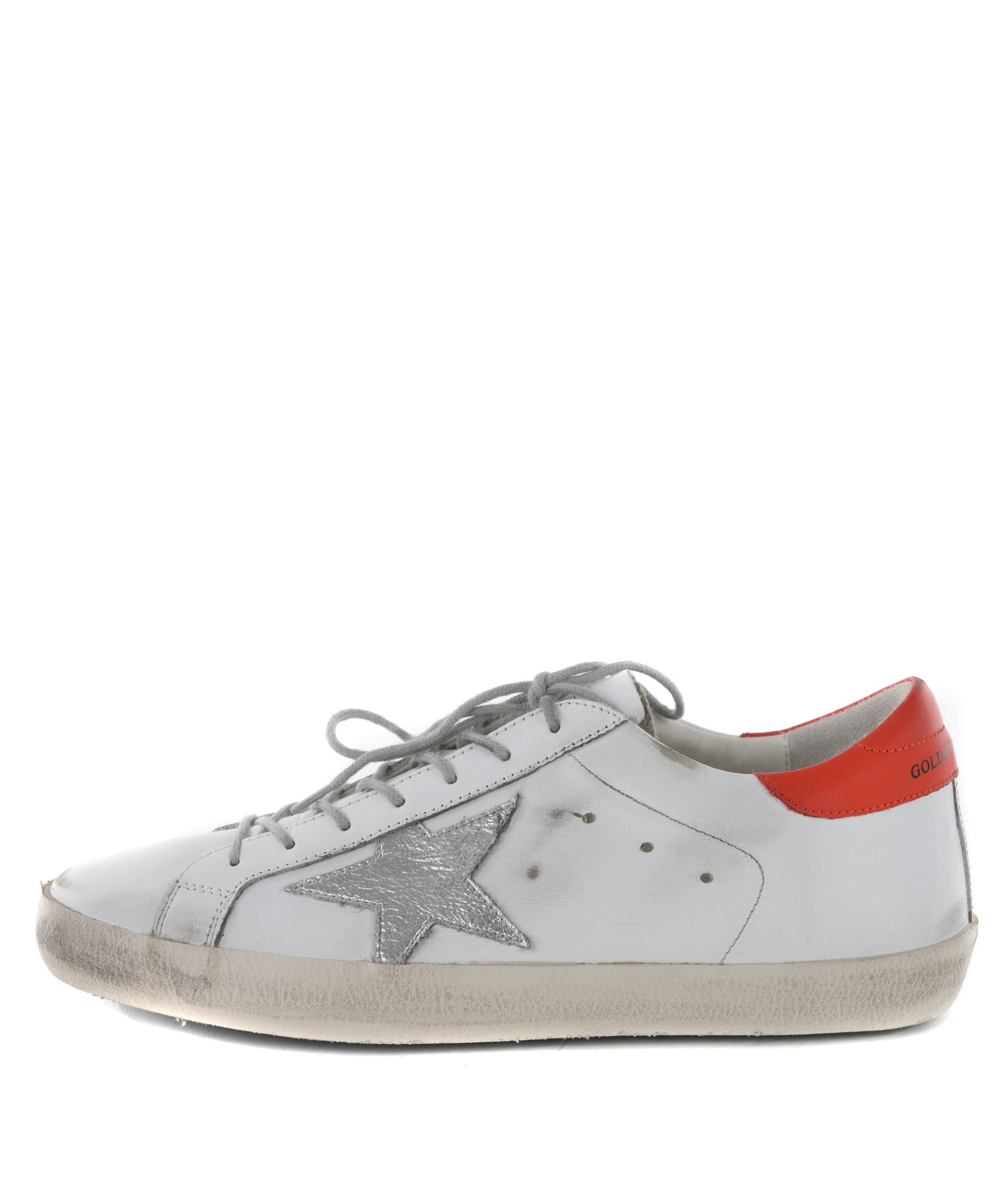 Superstar Sneakers from Golden Goose: White/Red Superstar Sneakers with round toe, lace-up front fastening, logo patch at tongue, star patch detail at side, perforated detail and flat rubber sole.