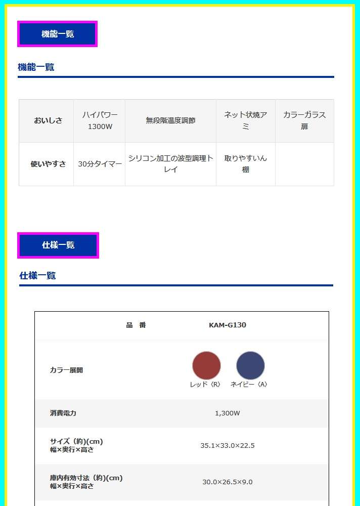 ●おいしさ:ハイパワー1300W/無段階温度調節/ネット状焼アミ/カラーガラス扉/クリア発光ヒーター