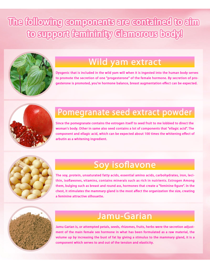 PUERARIAMIRIFIKA, pomegranate seed extract, embryo extractive of soybeans, pig abstraction placenta extract, training harrows, cellulose, gelatin (pig origin), stearic acid calcium, particle oxidation silicon, hyaluronic acid and artificial color (gardenia pigment and titanium dioxide)