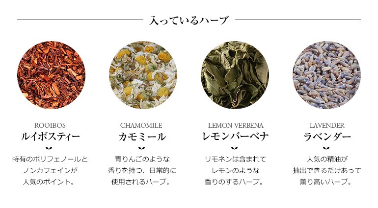 【原材料】オーガニック・ルイボスティー、オーガニック・カモミール、オーガニック・レモンバーベナ、オーガニック・ラベンダー