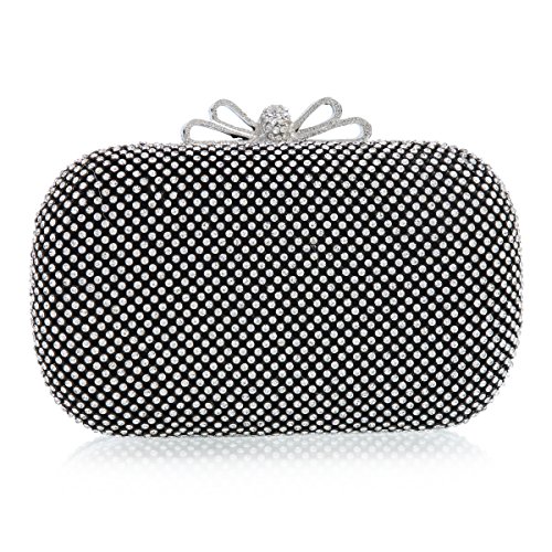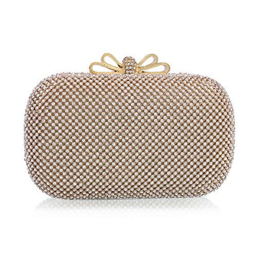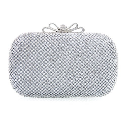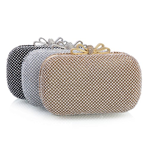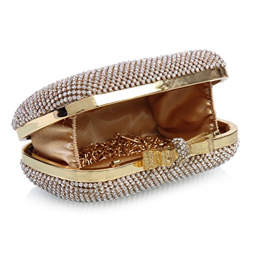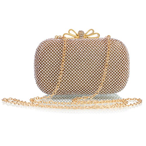 Product Description This flaring small evening bag is well made with allover sparkling rhinestones on the surface and a golden metal frame. The fashion hardcase design makes you the focus of crowds in the light.There is a standing metal bowknot adorn on the snap closure which is also decorated with shiny rhinestones.Interior is made of elastic satin fabric and offers just enough room for your party necessaries.2 removable chains are provided :a long one(120 cm/47.24 inch) and a short one(38cm/15 inch),which offer versatile carrying options as a handbag ,shoulder bag, or crossbody bag. Dimensions(approx):16.5 cm x 9.5 cm x 5cm(6.6"x 3.7"x2.0"inch) 0