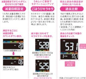 1カ月の減量目標を入力でき、測定値から目標までの数値をカウントダウン表示。さらに減少に応じたキラキラマーク表示や、前回値から最長1年前との比較表示で変化がひと目で分かる。
