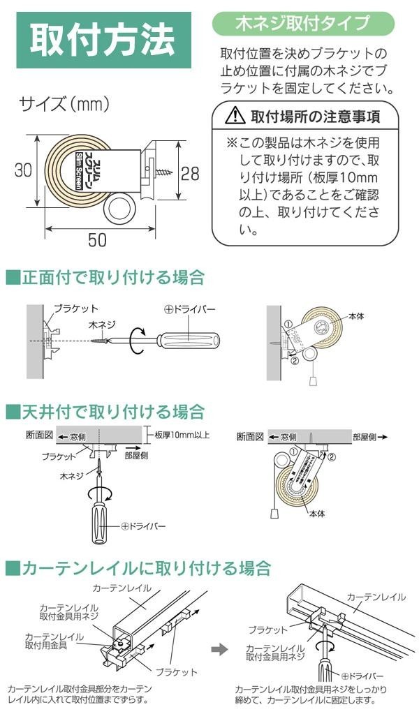 | セット内容 | スクリーン本体、ブラケット×2、木ネジ×2、カーテンレイル取付金具×2、カーテンレイル取付金具用ネジ×2、取扱説明書、保証書(保証期間:1年間) |