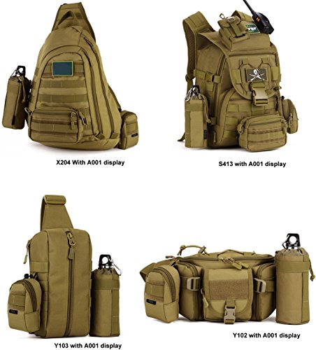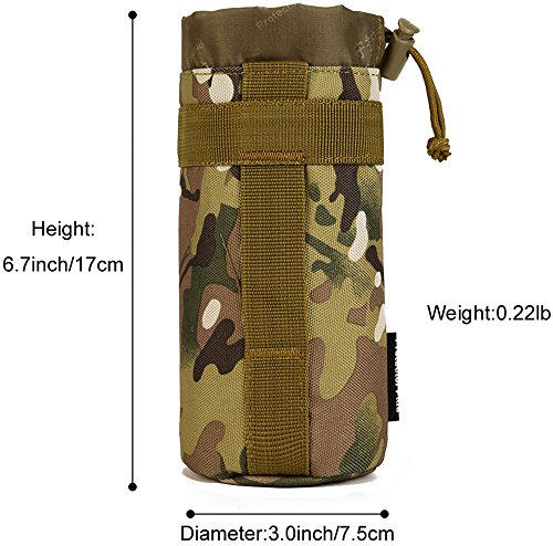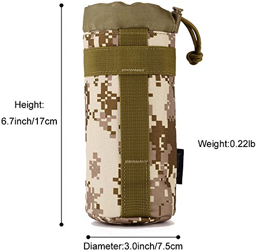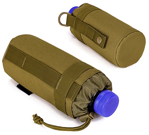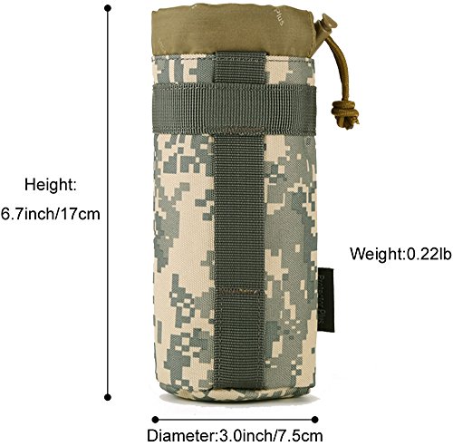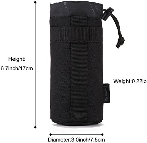 -. Feature : 1. Material: durable soft high-strength 1000D nylon, more suitable for outdoor use / 2. Capacity: fits for 500ml bottled water. Compact size: approx. 3"(D) x 6.7"(H);Weight: 0.22lb / 3. Can easily attaches to any MOLLE gear, and features external MOLLE webbing for additional MOLLE accessories. Make your backpack more personalized and practical / 4. Adopts a drawstring neck design, to well keep your water bottle accessible and safe / 5.Travel essentials, outdoor climbing leisure outings pocket, hiking cycling satchel. It is a stylish, comfortable and convenient way, to take your water or beverage with you, wherever you go