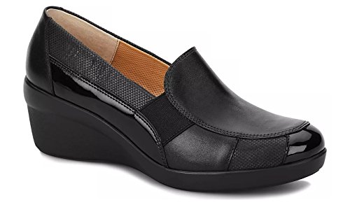 Product DescriptionComplete your look without losing comfort thanks to this "loafer" type sheepskin shoe with elastics for a better fit on the instep, lightweight wedge and combines a smooth, engraved and patent leather surface.0