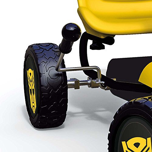 Transforming the world of go karting from the Planet Cybertron, introducing the Transformers Bumblebee pedal go Kart, get ready to “…roll-out!” Transformers pedal go karts provide an authentic driving experience featuring pedal power, sporty steering and low profile rubber tires! the Bumblebee design includes, aggressive front fairing, adjustable seat, double-touch single hand brake, 3 point steering and sturdy steel tube frame. Over and above, it encourages physical activity, builds strength, endurance and co-ordination. Go Kart is 44 x 21 x 22". holds up to 120 lbs.