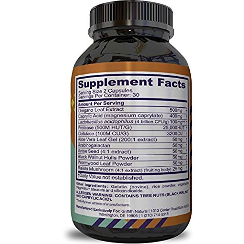 PROBIOTIC + DIGESTIVE ENZYMES dietary supplement with pure Oregano Leaf Extract Caprylic Acid Lactobacillus Acidophilus Protease Cellulose Aloe Vera Anise Seed Black Walnut Wormwood Leaf Reishi Mushroom.