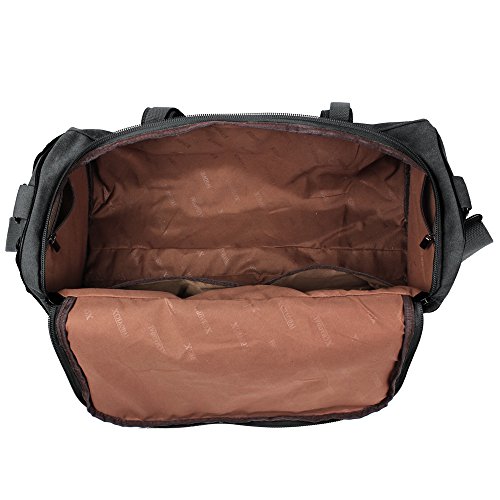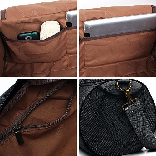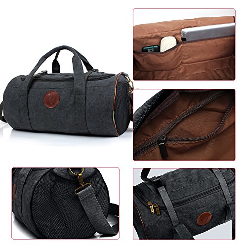 -. Feature : Material:Pure cotton canvas, lining- soft polyester. / Dimensions:19.3"L*10.63"W*10.63"H, 2.2 LB. / Capacity:Clothes, ipad, cell phone and so on. / Key features:Large capacity, durable material and retro style. / Function:Traveling/Sports/Outdoors/Gyms