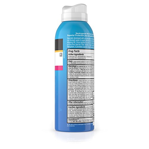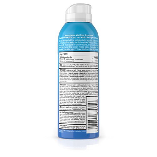Protecting skin from sun damage at the pool, beach, or in humid climates is easy with Neutrogena Wet Skin Sunscreen Spray with Broad Spectrum SPF 30. This convenient spray-on sunscreen cuts through water and applies directly to wet skin. On wet or dry skin, it forms a breathable protection to visibly repel water. This sunscreen is formulated with clinically-proven Helioplex, an advanced sunscreen technology with superior broad-spectrum protection from skin-aging UVA rays and skin-burning UVB rays. This sunscreen is oil-free and PABA-free.Feature