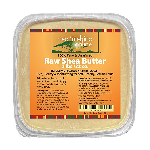 -. Feature : DON'T BE PERSUADED INTO BUYING LOW QUALITY SHEA BUTTER! Our Unrefined Raw Shea Butter has an all-natural Ivory color, is totally organic and imported directly from Ghana. Also check out our other body butters by clicking our store name next to the product title! / READY TO USE RIGHT OUT OF THE CONTAINER! No adding ingredients, watching complicated videos or scouring the internet trying to find a workable solution to use your butter. Our Unrefined Raw Shea Butter is provided ready to use straight out of the container. Use like a lotion or in addition to your favorite hand cream, body butter recipe or soap base. / GUARANTEED TO BE FRESH! Double-sealed from the manufacturer and packaged in a reseal able container, we guarantee you will receive 2 lbs of fresh shea butter that is easy to work with for use in all your DIY lotion, shampoo, lip balms, restorative conditioner and deep treating masque recipes! / 100% ORGANIC SKIN SOLUTIONS! Exceptional healing and moisturizing properties for skin. Improves small blemishes, stretch marks, scars, wrinkles, eczema & dermatitis. Properties can help treat skin allergies, insect bites, sunburns, frostbites & more. Use in the winter time for protection in cold weather conditions! / BONUS EBOOK - Included with every purchase, you will receive an Ebook that teaches you about the uses and benefits as well as a few recipes to get you started with your new product! Every Rise 'N Shine Online product comes with a 30-Day Money Back Guarantee. So click the Add to Cart button now and order your own Raw Shea Butter today!